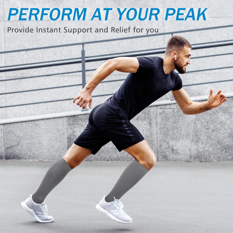 The compression socks are made of high quality nylon, Delivers 360-degree stretch for greater flexibility and durability, provide premium support, comfort, and relief without compromising your mobility.