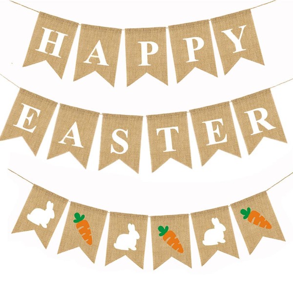 3 PCS Burlap Easter Banner, Rabbit Bunny Garland Banner, Happy Easter Bunting Banner for Party Decoration (Burlap)