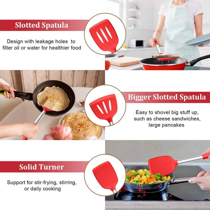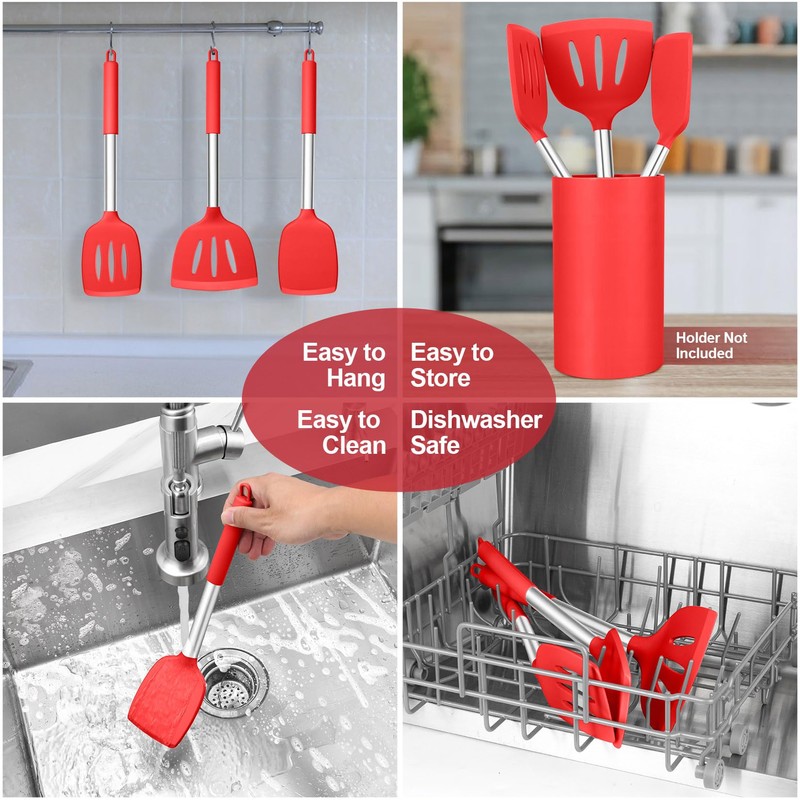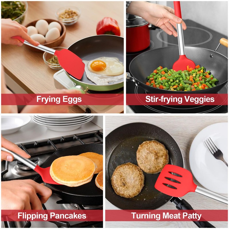 - 【Thoughtful Designs For User】Shiny stainless steel handle in the middle and red silicone covers both the handle top and spatula part, Achieve both striking and practicality, The non-slip and lightweight handle with ergonomic design to provide a comfortable grip, Each silicone utensil have a beveled and flexible edge that can shovel easily food onto the spatula with relatively little effort, Easier to flip small food by our utensils than by thick wooden kitchen utensils