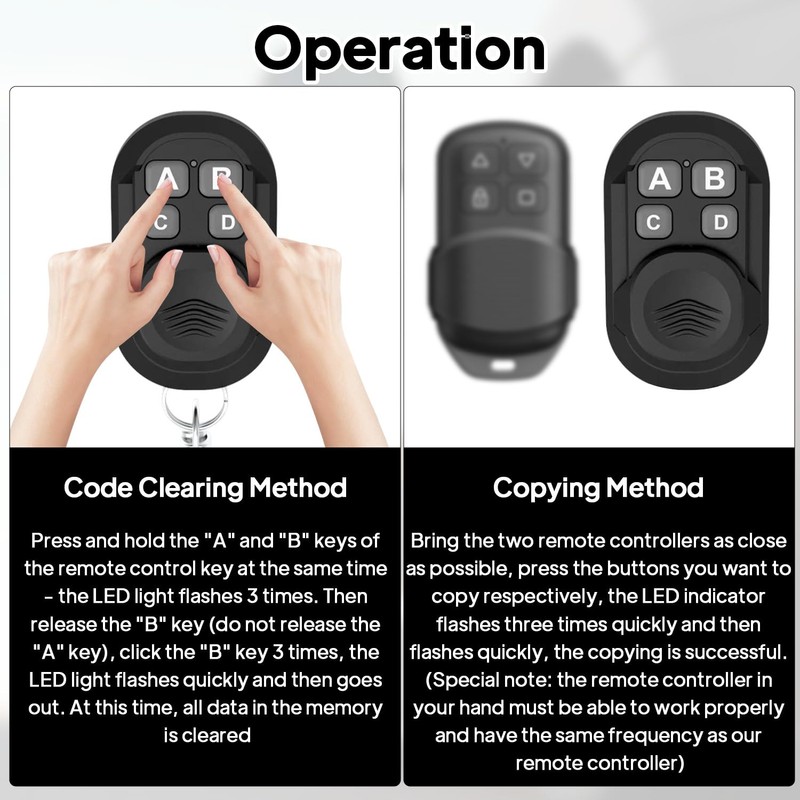 - 【Copying Method】When copying the remote, you need to bring the old and new remote controls as close as possible and press the keys to be copied respectively. The LED indicator light flashes three times and then flashes quickly. The copy is successful
