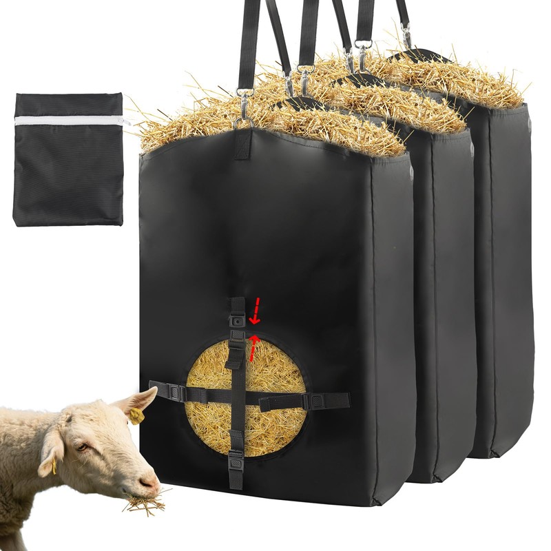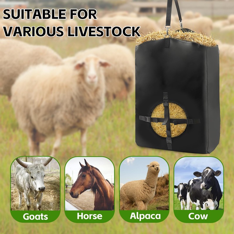 - 【Wide Range of Applications】 This hay feeding bag is specifically designed for storing hay and feeding goats. It is also suitable for horses, donkeys, cows, and other animals. With adjustable hanging straps, it can be easily hung indoors, outdoors, on trees, in pens, or on pastures. This multi-functional hay feed bag is designed to provide you with a reliable and convenient feeding option.