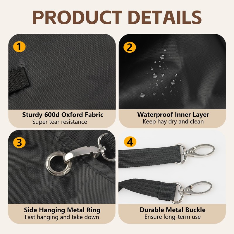 - 【Sturdy and Waterproof】 This goat hay bag is crafted from high-quality 600D Oxford fabric. It is highly resistant to being torn or bitten by animals, ensuring excellent abrasion resistance and durability. The inner layer of our slow feed hay bags for goats are added with waterproof material, which can effectively keep the hay dry and clean, allowing your animals to always enjoy the best hay.
