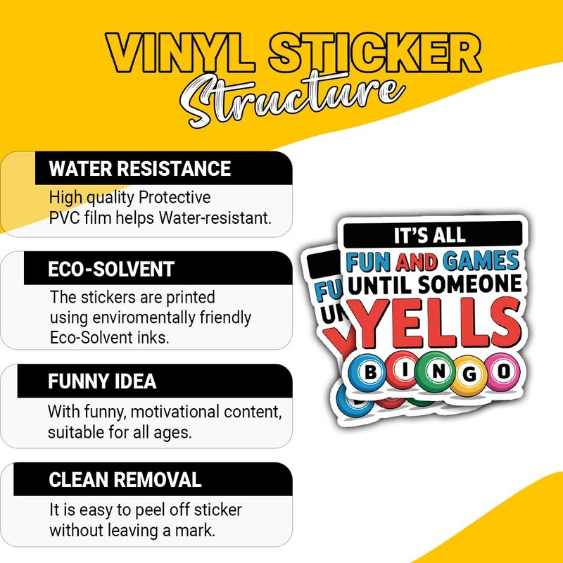 - 3 Pcs It’s All Fun And Games Until Someone Yells Bingo Sticker – Funny Senior Humor Quote Vinyl Decal Waterproof for Laptop, Water Bottle, Notebook – Gift for Retirees and Bingo Lovers – 3 Inch. Search us: it’s all fun and games until someone yells bingo sticker; funny bingo quote sticker; bingo humor sticker; senior citizen joke sticker; retirement humor sticker; hilarious bingo moment decal; bingo night quote; senior game meme; bingo hall funny sticker; sarcastic bingo saying; elder humor sticker; bingo tournament joke; laugh out loud sticker; bingo winner meme; lighthearted old age humor; nursing home bingo joke