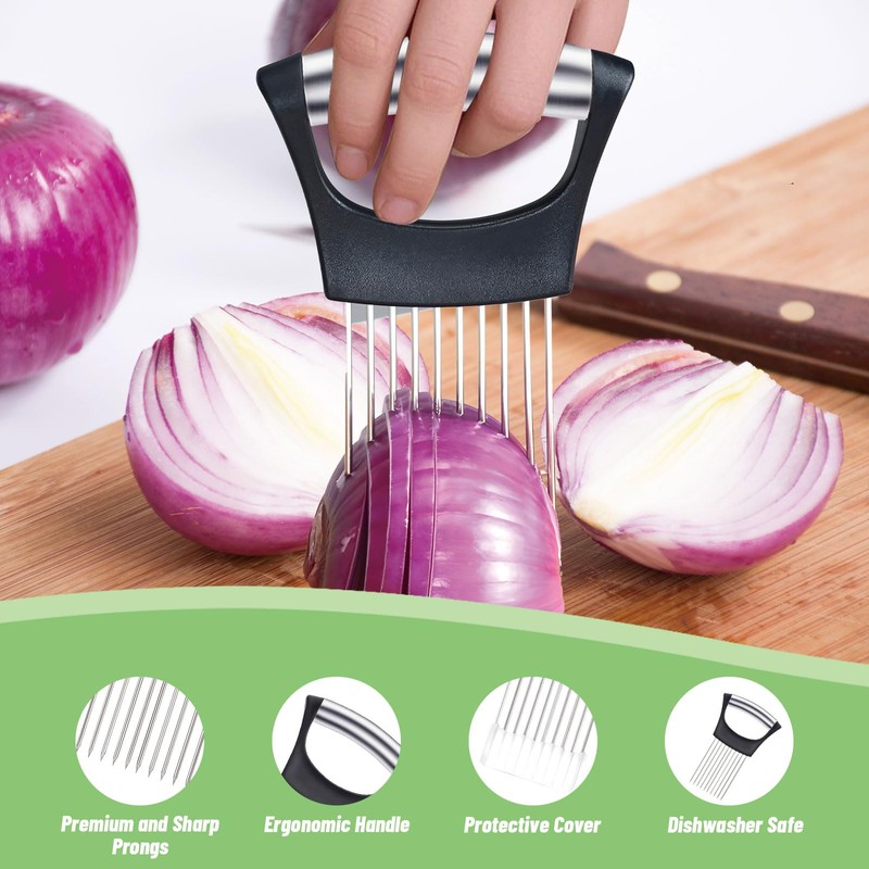 - 3 Pieces Multifunctional Kitchen Tool: Onion Holder Slicer features a unique design with 10 stainless steel forks under the handle,Comfortable grip and forks that are sharp and prevent slippage,Can slice onions evenly, So that you can keep away from onion irritation when cutting.