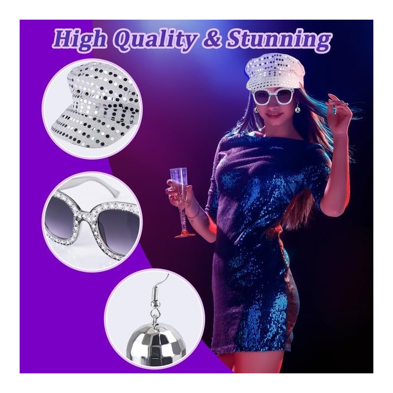 - Shimmering Silver Disco Hat Set: Includes 1 sequin hat, 1 pair of disco sunglasses, and 1 pair of dangle earrings.