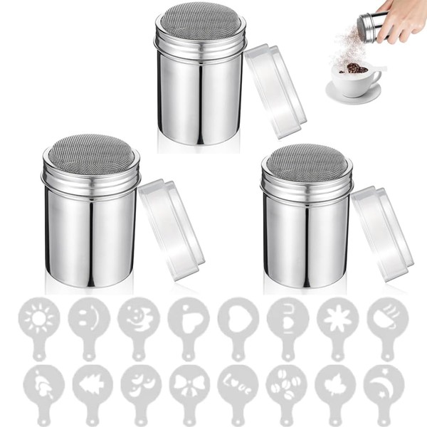 3 Pcs Stainless Steel Powder Shaker,Coffee Cocoa Seasoning Shaker Dispenser Fine-Mesh Lid,with 16pcs Printing Molds Stencils (3 pcs)