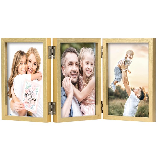 3 Picture Frame 4x6 Golden Triple Hinged MDF Wood with Glass Front Three Opening Photo Frame Stand Vertical on Tabletop
