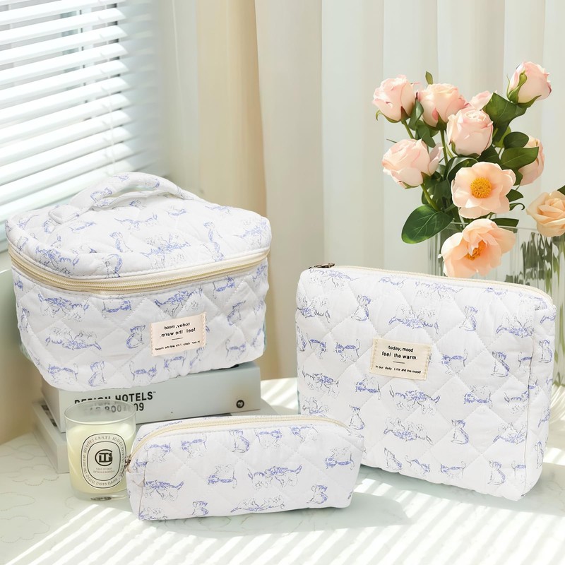 3 Piece Cute Blue Cat Animal Print Cotton Quilted Makeup Bag Set, Large Capacity Travel Makeup Bags for Women and Girls, Includes Small, Medium, and Extra Large aesthetic makeup&Cosmetic Bags