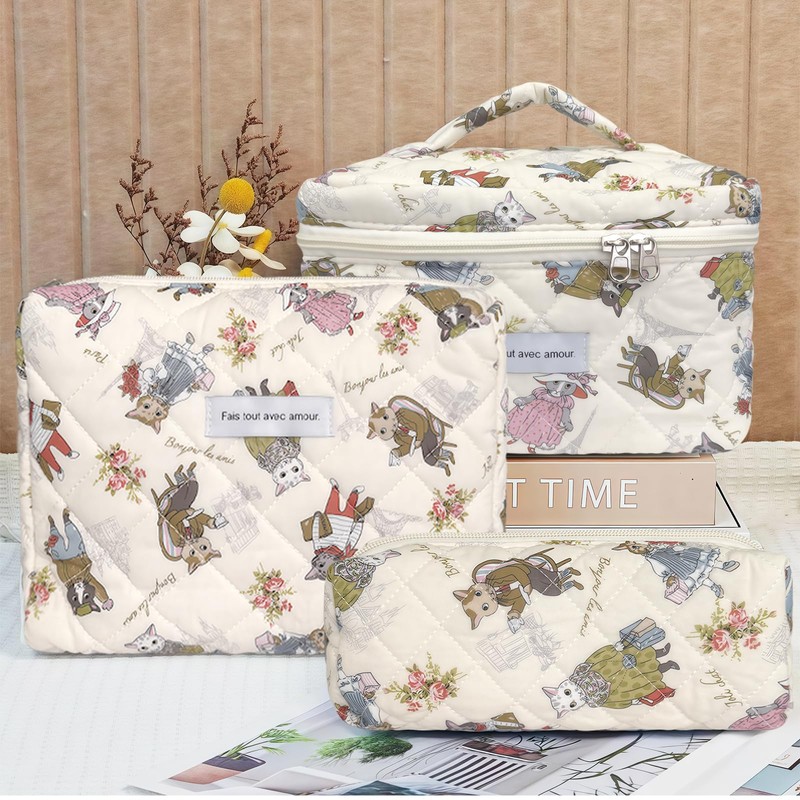 3 Piece Cute Cat Animal Print Cotton Quilted Makeup Bag Set, Large Capacity T...