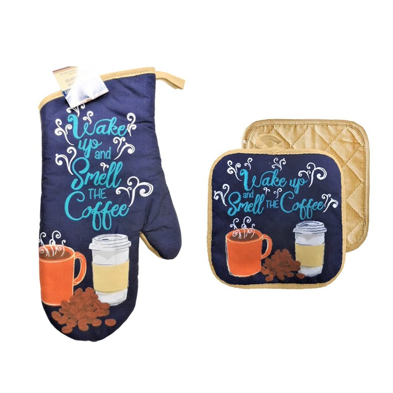 3 Piece Lightweight Decorative Kitchen Décor Set Includes 2 Potholders and 1 Oven Mitt (Coffee)