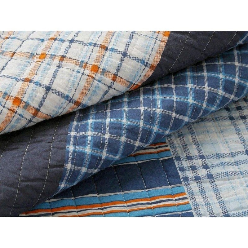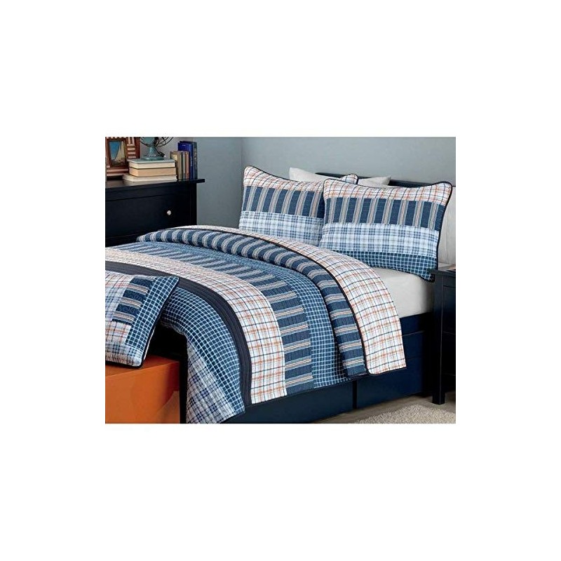 3 Piece Modern & Contemporary All Season Plaid Quilt 100% Cotton Cozy Line Navy Orange Stripe Chambray Stripe Patchwork Quilt Set Traditional Blue Bedding Queen Cozy Comfy Reversible Bedroom Decor