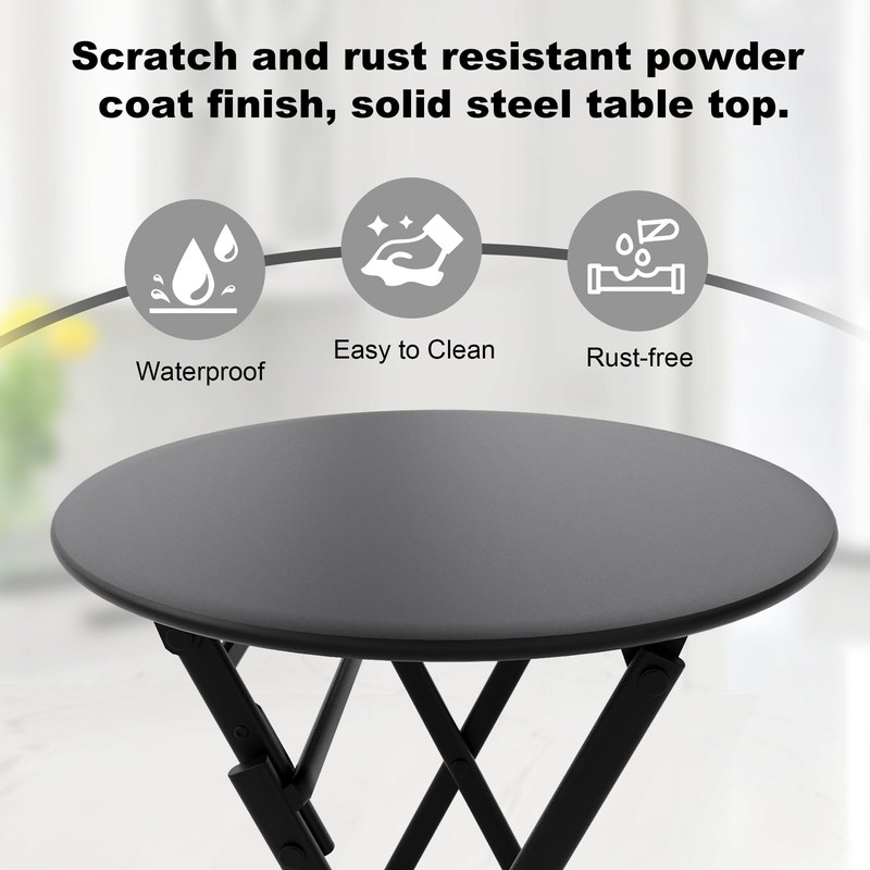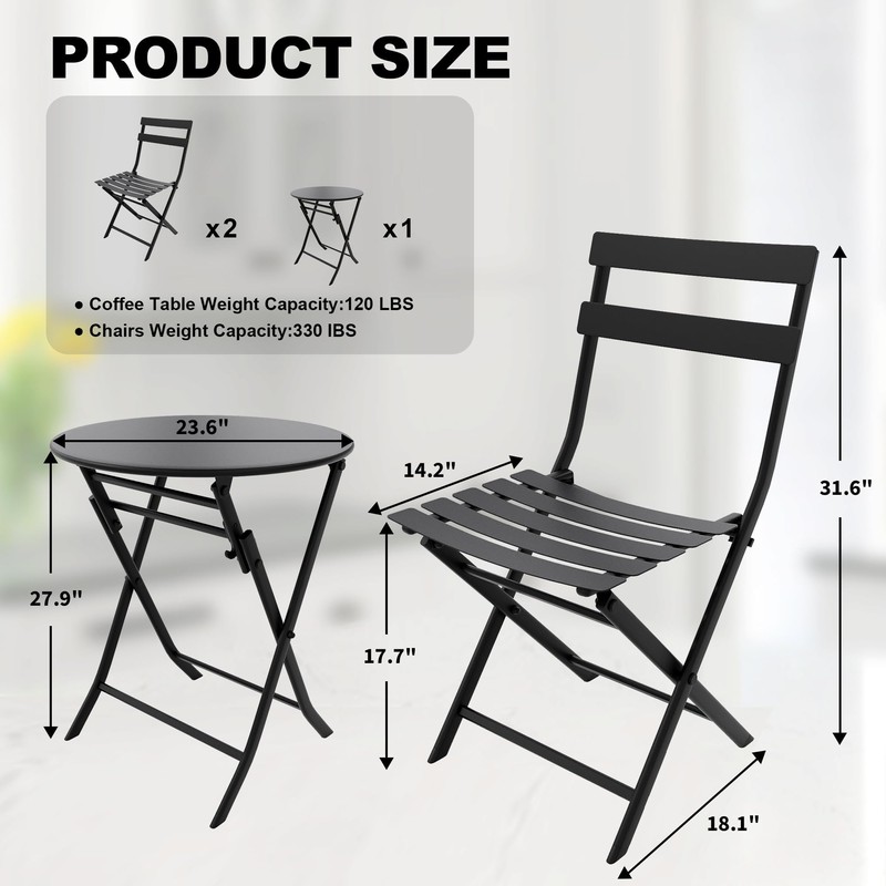 - 【Instant Fold-and-Carry Convenience】 Transform your outdoor space in seconds with this lightweight 3-piece bistro set featuring a folding mechanism. The table and chairs collapse into slim panels for effortless storage in closets, sheds, or car trunks. Ideal for spontaneous picnics, camping trips, or apartment balconies. Powder-coated metal frames ensure stability without bulk, while the compact design maximizes seating in tight areas.