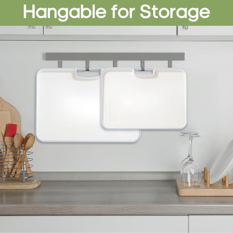 - 360°TPR Wrapped Edge: The cutting board is surrounded by a one-piece TPR edge, offering shock absorption and anti-slip properties to ensure stability during cutting. The handle includes a hook hole for easy hanging and storage, saving kitchen space with practical convenience