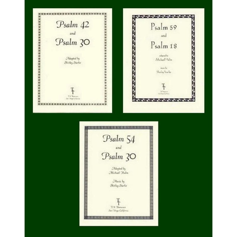 This set of three pieces of sheet music includes settings of Psalm 54, 30, 59, and 18 adapted by Michael Halm of Presentation Ministries, and Psalm 42 and 30 adapted by Shirley Starke, who set them to music. (The two versions of Psalm 30 are very different from each other.) Each piece includes two Psalms, one of supplication and one of thanks and joy; the music is especially appropriate for Easter but may be sung any time. Click here to see them individually.