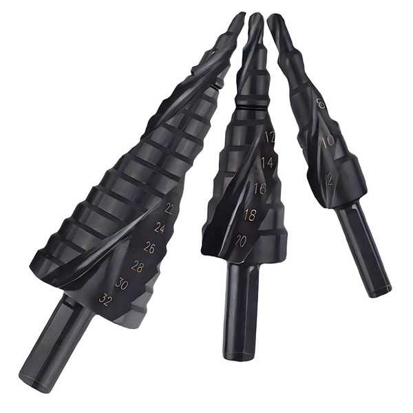 3-piece Set Step Drill, Triangular Shaft Spiral Drill, Bamboo Wood Drill, Titanium Coated Spiral HSS Steel Drill, Drill Bit, 0.1 - 1.3 inches (4 - 32 mm), 15 Steps, 0.1 - 0.8 inches (4 - 20 mm), 9