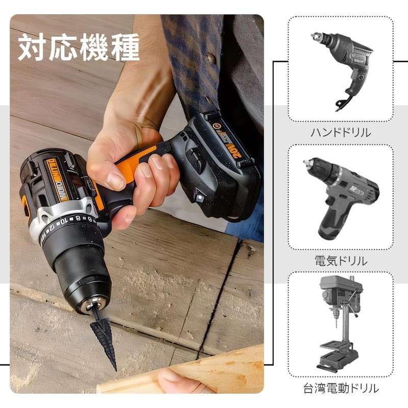 The spiral design reduces pressure during cutting, better discharge and smoother cutting than conventional step drills. Stair grooves prevent chuck from slipping