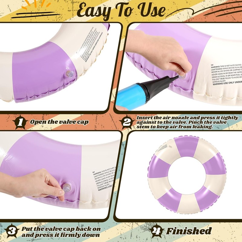- [User-friendly design and portability] The striped swimming ring is equipped with a leak-proof nozzle and a special valve design for easy inflation with an electric air pump or compressor. If the inflator is removed after inflation, the air is not deflated immediately. The foldable packaging design makes it easy to carry.