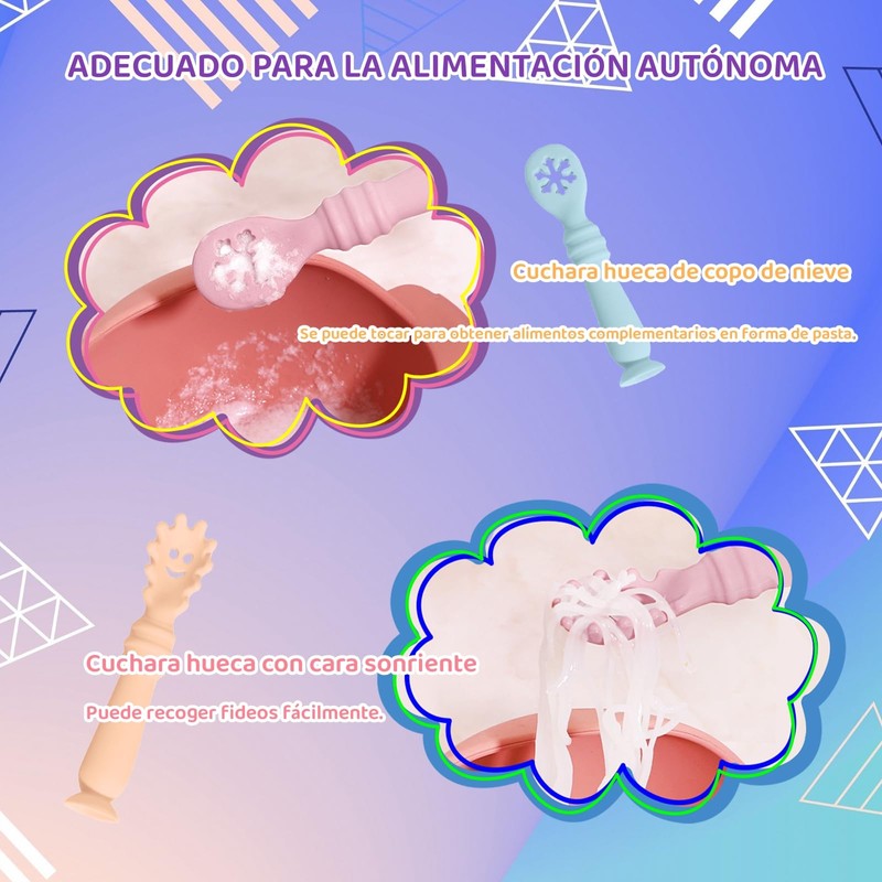- [Diseño Ergonómico] Las cucharas de comer para bebés están diseñadas con un mango antideslizante y un mango redondo y regordete en relieve; el mango suave, cómodo y firme proporciona un agarre estable para las manos pequeñas y no resbala fácilmente. Con base de ventosa, la cuchara no toca la mesa y su uso es higiénico.