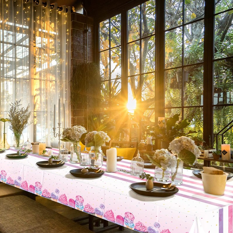 Adecuado para decorar las mesas en interiores o exteriores, desechable para una fácil limpieza, puedes colgarlas en puertas o paredes para usar como fondos decorativos o ponerlas en la habitación como pancartas para una fiesta temática de helados aún mejor.