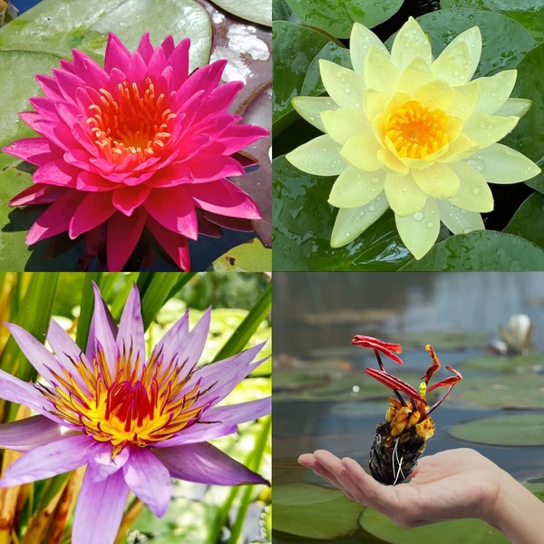 3 Pre-Grown Hardy & Tropical Waterlilies Rhizomes Live Tuber in Yellow, Red, Blue Flower for Indoor-Outdoor Pond Decoration