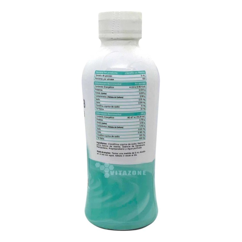 3 PZS Clorofila con Matcha 500 ml Vidanat. Beneficios principales: - Fuente de energía - Eliminación de toxinas - Antioxidante - Disminución del olor corporal Modo de uso o empleo: Tomar una medida de 5mL disuelta en un vaso con agua, beber 3 veces al día. Restricciones: Consulte a su médico antes de ingerirlo si está embarazada o en periodo de lactancia. No se deje al alcance de los niños. Consérvese en un lugar fresco y seco. Ingredientes principales: Clorofilina Sódico cúprica, Matcha en polvo, Esencia de menta, Esencia de hierbabuena. ESTE PRODUCTO NO ES UN MEDICAMENTO. EL CONSUMO DE ESTE PRODUCTO ES RESPONSABILIDAD DE QUIEN LO USA Y DE QUIEN LO RECOMIENDA.