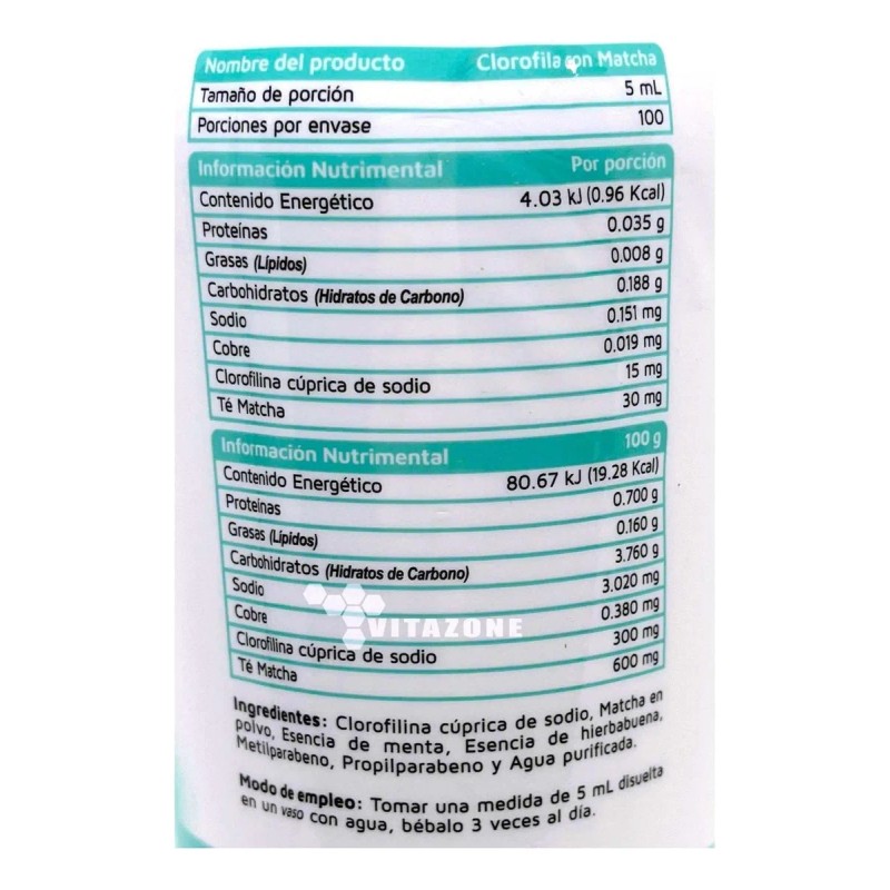 - Disminución del olor corporal Modo de uso o empleo: Tomar una medida de 5mL disuelta en un vaso con agua, beber 3 veces al día. Restricciones: Consulte a su médico antes de ingerirlo si está embarazada o en periodo de lactancia. No se deje al alcance de los niños. Consérvese en un lugar fresco y seco. Ingredientes principales: Clorofilina Sódico cúprica, Matcha en polvo, Esencia de menta, Esencia de hierbabuena. ESTE PRODUCTO NO ES UN MEDICAMENTO. EL CONSUMO DE ESTE PRODUCTO ES RESPONSABILIDAD DE QUIEN LO USA Y DE QUIEN LO RECOMIENDA.