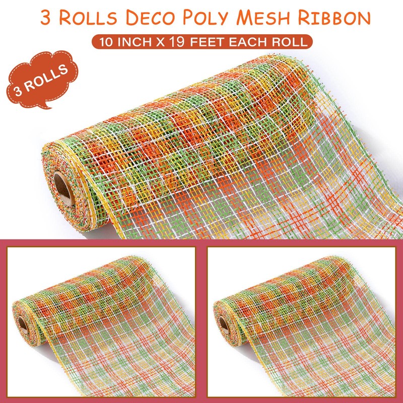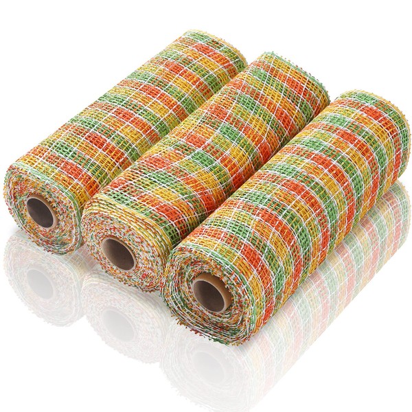 3 Rolls Fall Poly Burlap Mesh 10 Inches Plaid Check Deco Mesh Wreath Supplies - Yellow Green and Orange Multi Stripe Thanksgiving Decorative Poly Mesh Ribbon for Wreaths DIY Crafts Making Supplies