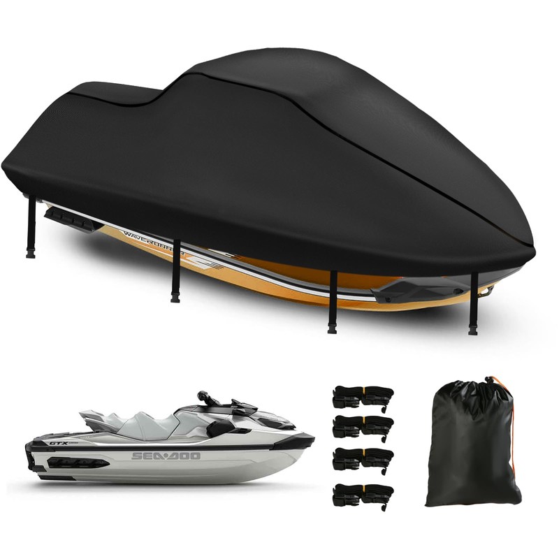 Introducing our premium jet ski cover 3 seater - the ideal protection for your motorboat!This top-notch Sea Doo cover is crafted from durable 420D Oxford fabric designed to provide maximum coverage and exceptional durability. Whether it's for outdoor storage or transportation, this jetski cover has got you covered. It's easy to install and convenient to clean. The robust fabric safeguards your waverunner from dust, debris, rain, and other harmful elements.Designed in black and silver, the silver portion effectively reduces heat exposure to the top instruments and seats, preserving the condition and lifespan of your Sea-Doo. The cover has sturdy elastic bands at the bottom front and back for a snug fit around your boat vehicle. Also, the clearly marked 'front' allows for easy identification, making installation and removal more convenient.Our Jetski cover Waterproof outdoor accommodates a variety of models, fitting various lengths from 96 to 102 inches,103 to 115 inches,116 to 125 inches, 126 to 135 inches, and 136 to 145 inches. Additional four independent straps provide extra secureness, particularly during transportation. Rear vents help mitigate wind lofting, greatly minimizing potential damage during transportation.With the purchase of the pwc cover, you'll also receive a large storage bag for storing the jetski accessory when not in use, as well as four extra independent support straps.Invest in a jet ski watercraft cover, because your jet ski deserves the best protection!