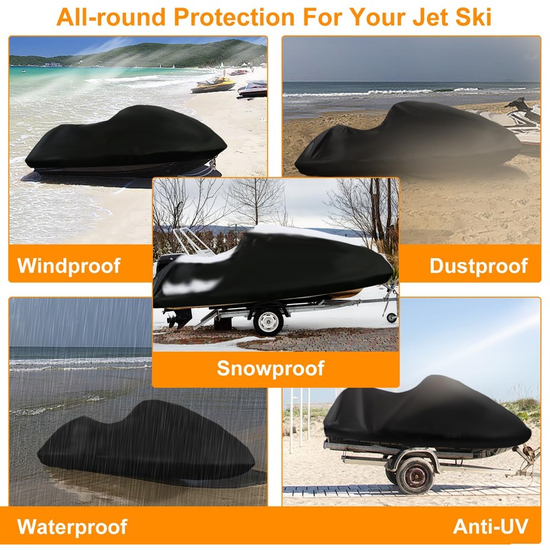 • 420D Waterproof Jetski Cover: Our 3 seater jetski cover is made of 420D oxford fabric with nano material coating inside,the inner layer is extra smooth,soft and resilient.It won't scratch your See-Doo.Double thread sewing process at the joints,added waterproof tape,able to resist 10000MM water pressure.UV protection index(SPF)up to 80+. It it good at tear resistance and UV resistance