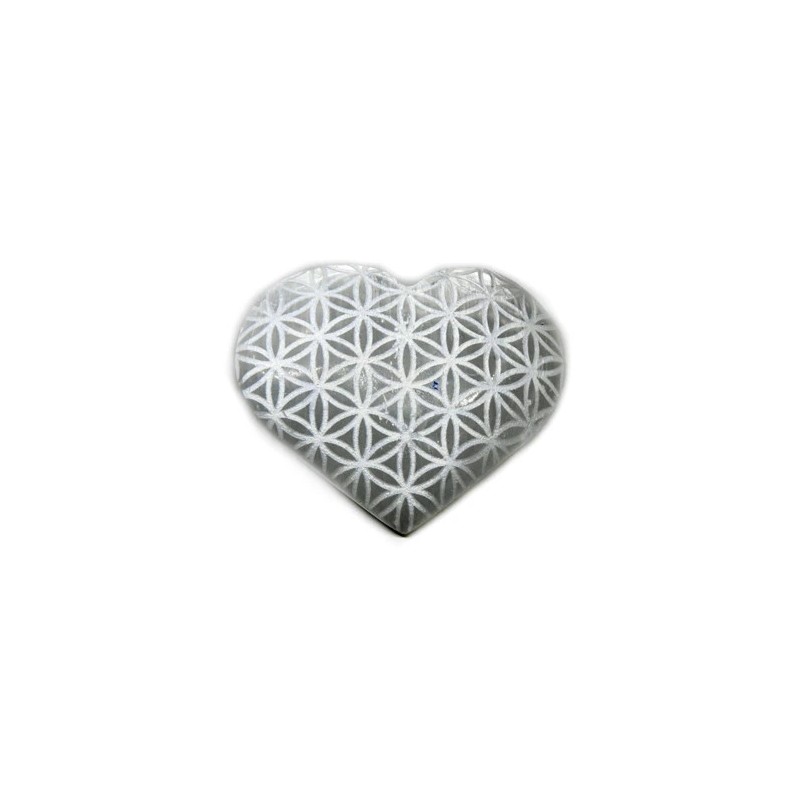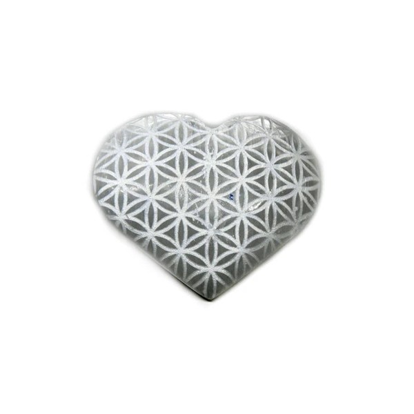Selenite heart with an elegantly carved Flower of Life on one side and a smooth surface on the other. This piece will help you feel the connection in everything when you hold it in your hands and in your heart. Selenite is a high vibrational stone that helps with protection, good luck, and it can clean, clear and open all chakras. Will charge other stones and crystals around it and help keep you grounded and calm. Do not get wet as it will breakdown. 3" wide Selenite heart from India. Sizes, shapes, and natural lines and inclusions may occur.