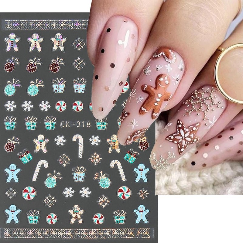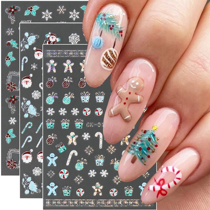- 🎅PERFECT NAIL STICKER SET: 3 sheets stickers are the perfect Christmas fashion accessories. Includes all sorts of classic Christmas-style images: Gingerbread, Santa Claus, Snowflakes and any other christmas accessories. Great to create your unique awesome Christmas nail designs. It is fun to DIY nail art with your family or friends when family gathering and party, enjoy your own shining and special look nails and the good time.