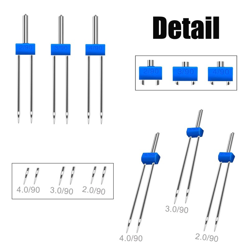- Package Includes : 3 x Twin Needles 2.0/ 90, 3.0/ 90, 4.0/ 90, the sizes are clearly marked in the blue area.