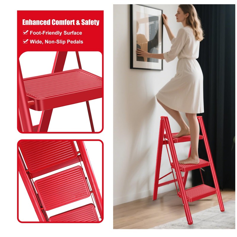 Reach new heights with the 3-Step Folding Step Stool for Adults! Designed for safety and convenience, this lightweight, portable stool features wide anti-slip pedals and an ergonomic handrail for stability. Perfect for home, kitchen, or office use, it folds to just 1.6 inches thick for easy storage and transport. Durable steel construction ensures long-lasting performance, while the vibrant red finish adds a stylish touch. Whether you're grabbing items from a high shelf or tackling household tasks, this step stool is your go-to solution. Get yours today and make every step easier!
