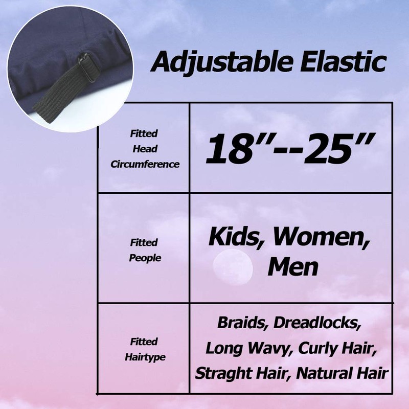 - Diseñado para todos los tipos de cabello. Las gorras de dormir forradas de satén de seda se han creado para todos los tipos y longitudes de cabello: rastas, trenzas largas, encrespadas, sueltas, rectas. El satén suave ayuda a retener la humedad en tu cabello, elimina la rotura mientras duermes. Mantiene tu peinado fresco y sin encrespamiento. Evita enredos, roturas y secar el cabello dañado durante el sueño