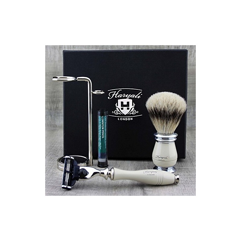 - Our men's shaving set comes with a razor, shaving brush, shaving stand and alum pencil. Comes in a beautiful black box and can be a perfect gift set for your son, dad, friends and family members on birthday, Thanksgiving or Christmas.