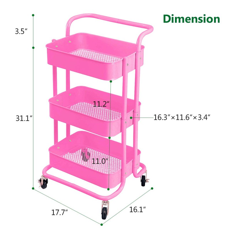3-Tier Metal Mesh Rolling Cart Storage Organizer with Utility Handle and Wheels, Pink