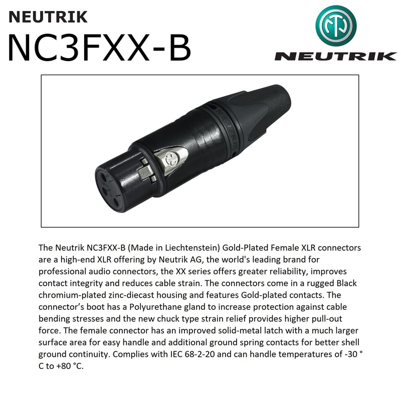 - We terminate these PRO cables with the best plugs in the industry for the ultimate value: The NC3FXX-B is the latest and the highest-end Female XLR offering by Neutrik AG-Liechtenstein, the world's leading brand for professional audio connectors. XX series offers greater reliability, improves contact integrity, and reduces cable strain, comes in a Black metal housing and features gold-plated contacts.