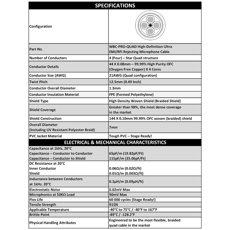 - WBC-PRO-QUAD is truly the Most-Silent & the Most-Flexible Star-Quad cable in the market & boasts a tough UV-protected outer jacket, a dense braided shield (above 98% coverage) & four, 0.08mm Fine-Stranded 99.99% Oxygen Free Copper cores totaling to 21AWG. Excellent shielding coupled with the Star Quad design totally cancels out all EMI & RFI, this stage-ready cable will encounter, resulting in the purest form of signal transmission. Superior to Industry leaders like Mogami 2534 & Canare L-4E6S.