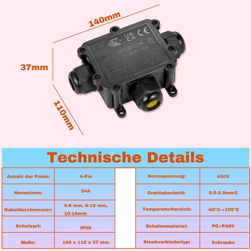 - 【Specification】: protection class: IP68, rated current ≤ 24A, rated voltage ≤ 450V, suitable cable: diameter 4mm-14mm, operating temperature -40℃±105℃, dimensions: 140 x 110 mm x 37 mm. There are a total of 3 sets of different size sealing rings, which are suitable for cable diameters of 4-8 mm, 8-12 mm, 10-14 mm.