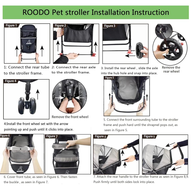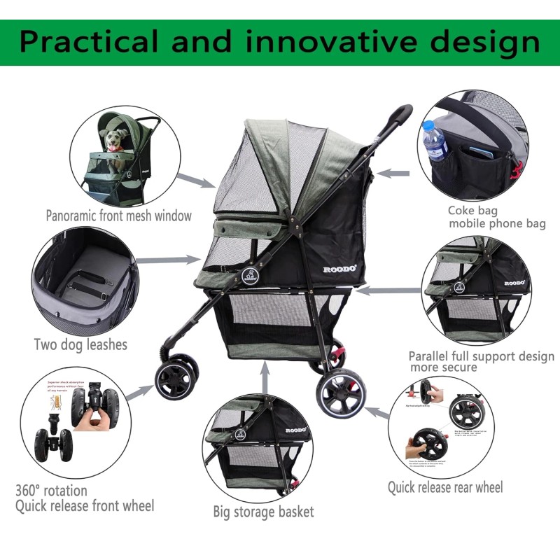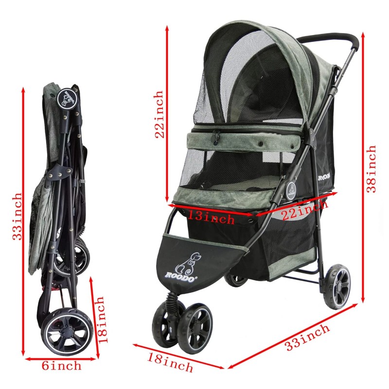 - ROODO multifunctional three-wheeled pet stroller is smooth and easy to use. The pet rest area is covered with multi-directional breathable nets to enjoy the fresh air and protect your pets from insects. Equipped with a storage basket for easy storage of items. The pet stroller can be folded easily and compactly enough to fit into the trunk of the car. It is a great choice for walking, jogging, and traveling. Bring your pet to enjoy outdoor activities with you.