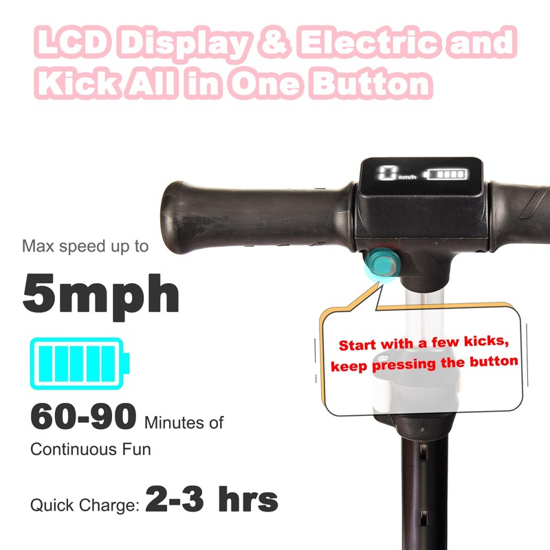 - Upgraded 3 Wheel Electric Scooter for Kids features an intuitive LCD display that visually shows speed and battery level, a kick start thumb throttle button, and a mechanical rear brake, ensuring secure and controlled stops for a worry-free riding experience. This kids electric scooter has passed UL 2272 testing.