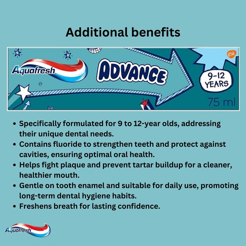 - Aquafresh Advance Toothpaste specifically designed for kids aged 9-12 years, addressing their developing dental needs.
