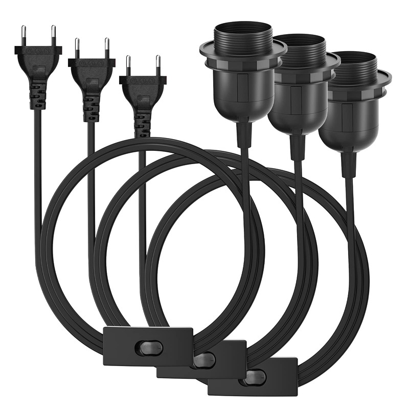 3 x E27 Lamp Holder with Cable, Lamp Holder with Switch with EU Plug, E27 Socket with Cable for Lamp Hanging, Pendant Light, Black