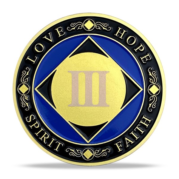 The obverse side of the narcotics anonymous medallion features na symbol with word: Love, Hope, Spirit, Faith. Center is laser roman numeral Ⅲ.