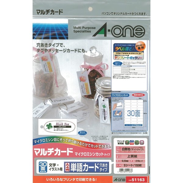 エーワン マルチカード 30面 単語カードサイズ 穴あき 5枚 51163