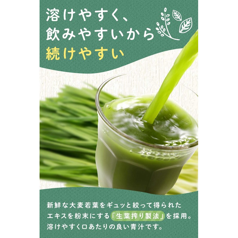 - 原材料名:大麦若葉(国産)、デキストリン、ガラクトオリゴ糖粉末、水溶性食物繊維 内容量:225g(7.5g×30袋) 保存方法:高温・多湿および直射日光を避けて保管してください。
