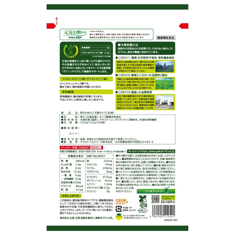 ヤクルトヘルスフーズ 青汁のめぐり30袋 (平袋)大分県産 大麦若葉 食物繊維 ヤクルトのガラクトオリゴ糖 ほんのり甘い