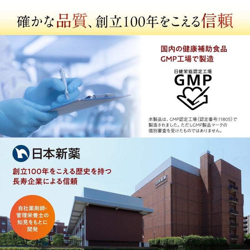 - ✅国内GMP認定工場で品質管理 日本国内の健康補助食品GMP認定工場(認定番号:11805)での品質管理体制のもと製造されています。また、製造ごとに品質試験を実施し、徹底した品質管理を行っています。