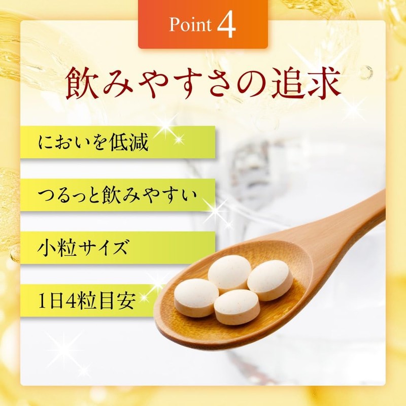 - ✅小粒設計で毎日のケアを手軽に 1日4粒を目安とした小粒タイプで、つるっと飲みやすい形状。ライフスタイルに合わせやすい設計です。