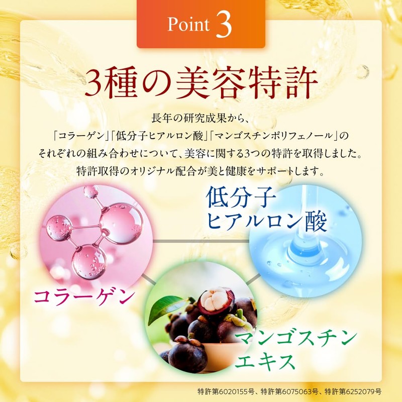 - ✅美容特許成分配合 コラーゲン、低分子ヒアルロン酸、マンゴスチンエキスのそれぞれの組み合わせについて、美容に関する特許を取得しました。(特許第6020155号、第6075063号、第6252079号)